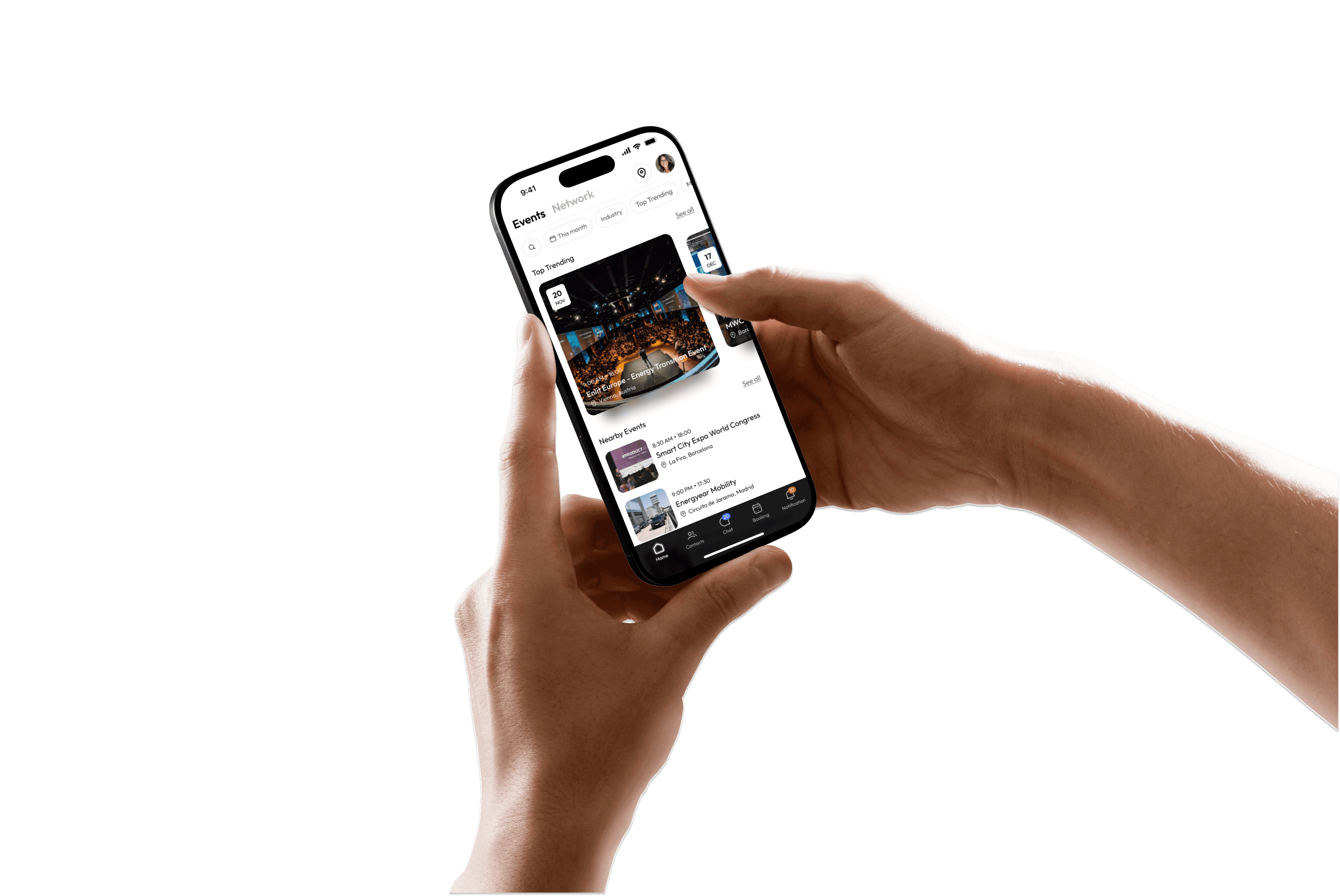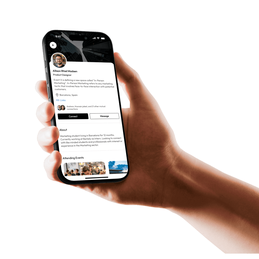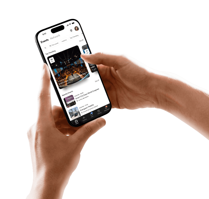 Filter by event to see who’s attending, or switch to location mode to discover contacts in your city